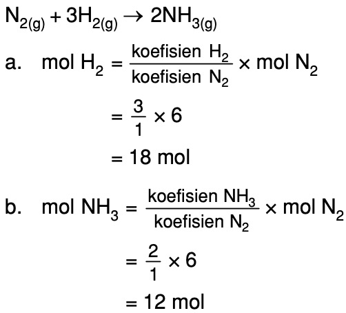 Pada reaksi pembentukan gas amonia (NH3) dari gas nitrogen dan hidrogen, jika gas nitrogen yang direaksikan 6 mol, tentukan: