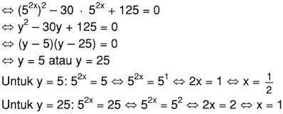 Himpunan penyelesaian dari persamaan eksponen 252x – 6 . 52x + 1 + 125 = 0 adalah ….