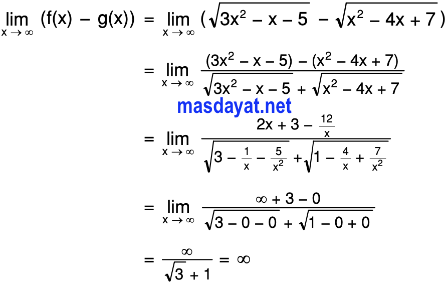 Jika f(x) = √3x2 - x - 5 dan g(x) = √x2 - 4x + 7, tentukan nilai lim x→∞ (f(x) - g(x))!